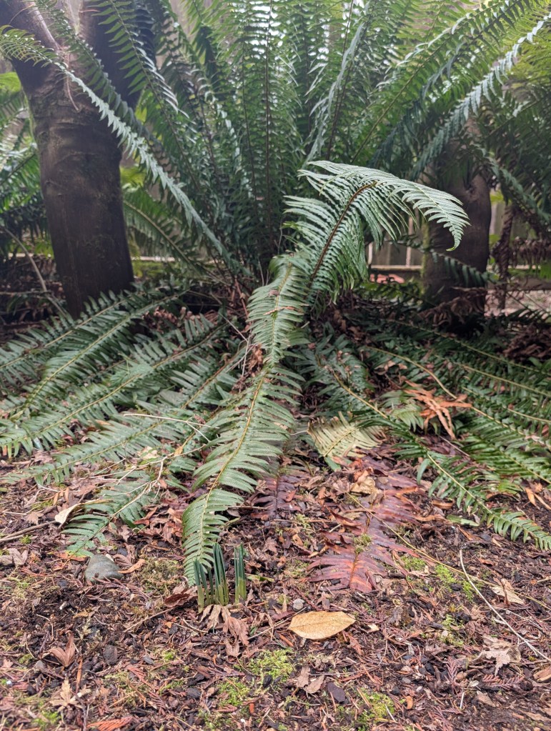 Spring is definitely coming! Daffodils coming up in front of a fern in the courtyard.