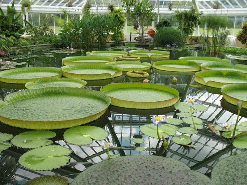 These giant lily pads enchant and amaze! Night blooming pineapple scented flowers adorn giant leaves. Learn more below: Victoria amazonica – Plant Finder — [image above from this site] Missouri Botanical Garden Giant waterlily – Victoria amazonica | Plants | Kew